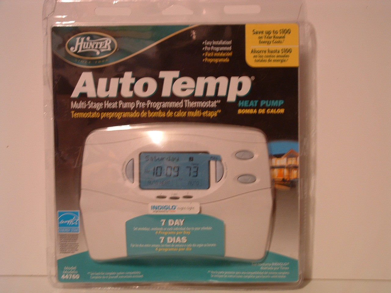 Image: Hunter 44760 Thermostat packaging showing the thermostat's front panel with its digital display (showing 10:09 and 73 degrees) and various control buttons below it.