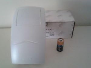الشكل 1: Urmet 1055/101 Infrared Detector, 3.6V battery, and product packaging. This image displays the Urmet 1055/101 Infrared Detector, a white rectangular device with a slightly curved front. Beside it is a 3.6V battery, and in the background, a white product box is partially visible. The detector appears compact and designed for indoor use.
