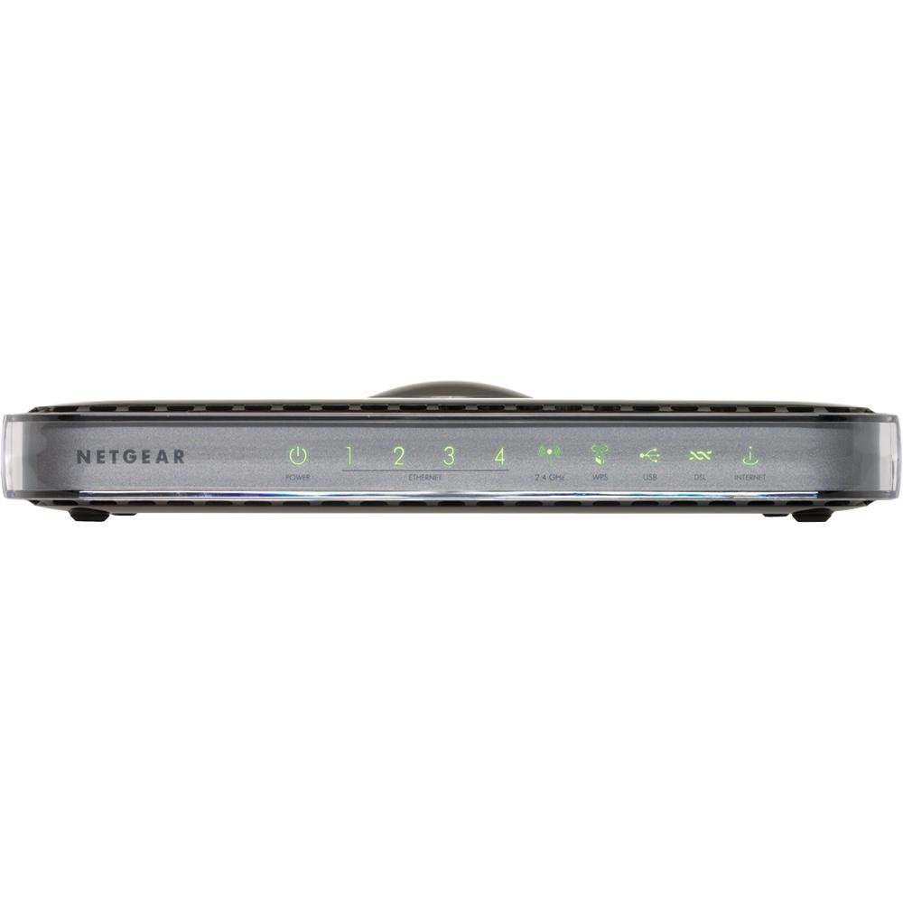الصورة: الجبهة view of the NETGEAR DGN3500 N300 Wireless Gigabit ADSL2+ Modem Router, showing its indicator lights and sleek design.