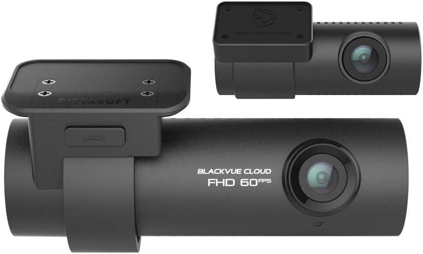 Image: The Blackvue DR750S-2CH dashcam system, showing both the front and rear camera units. The front camera is larger and features the 'BLACKVUE CLOUD FHD 60FPS' branding, while the rear camera is more compact.