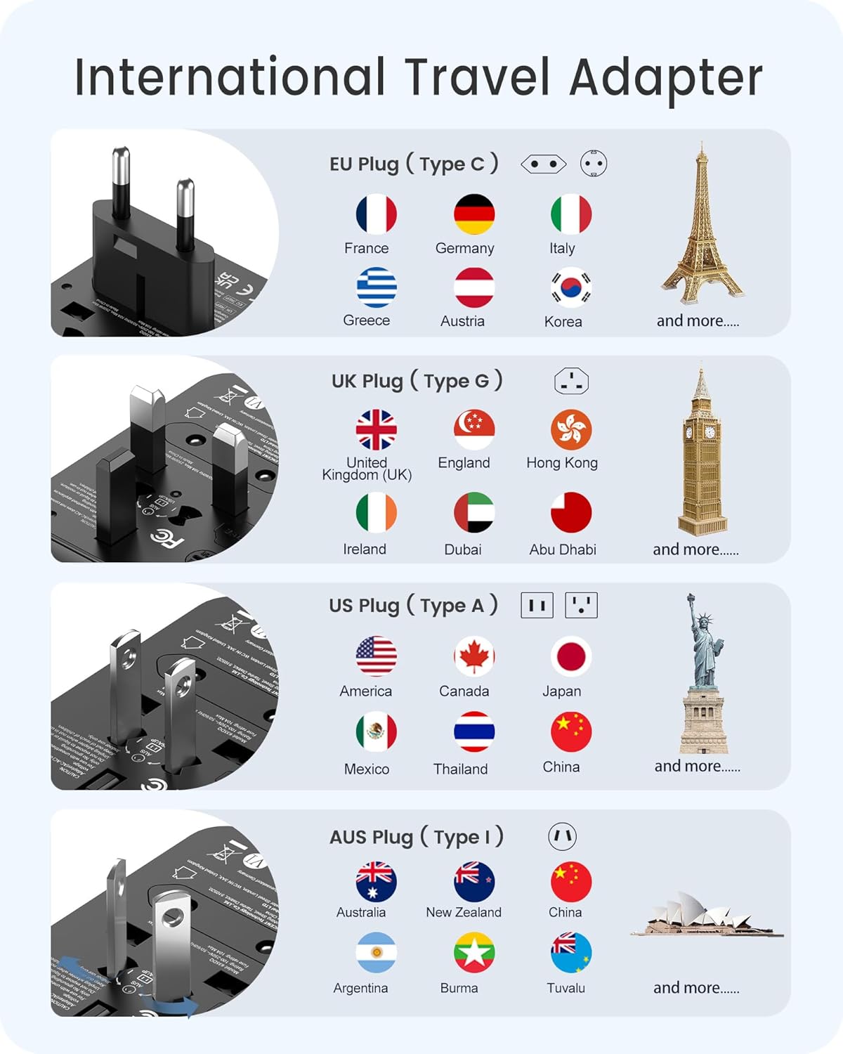 - Identify the required plug type for your destination (e.g., EU, UK, USA/AUS).
