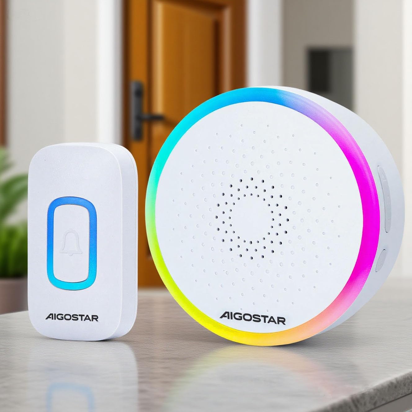 The Aigostar Wireless Doorbell set, featuring a white transmitter and receiver unit.