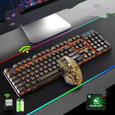 تُظهر هذه الصورة طقم لوحة المفاتيح والماوس اللاسلكيين T3. تتميز لوحة المفاتيح بإضاءة خلفية برتقالية على مفاتيحها، بينما يتميز الماوس بنمط أسود وبرتقالي مميز. أسفل لوحة المفاتيح، تشير الرموز إلى الاتصال اللاسلكي عبر مستقبل USB وبطارية قابلة للشحن.
