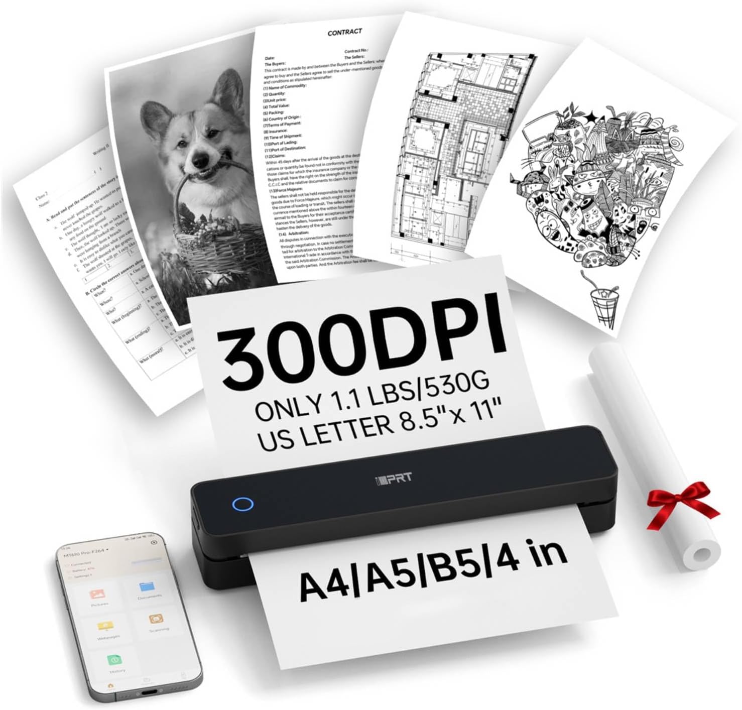 Figure 1: The iDPRT MT610 Pro Portable Thermal Printer in operation, showcasing its compact design and ability to print various document types at 300 DPI resolution.